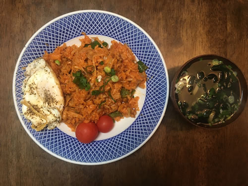 本日の昼飯。ケチャップライス目玉焼きとプチトマト添え&ワカメ入り永谷園の松茸のお吸い物。