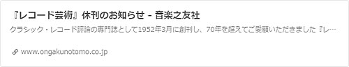 まあ、もう音楽は配信ものと実演が主力になってしまったから、確かに「レコード」という現物を批評する雑誌の使命は終わったのだろう。それにしてもである。