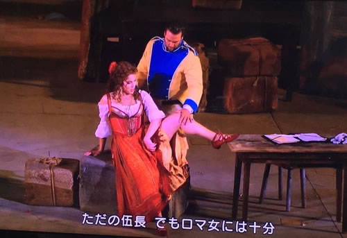 御御足を曝け出すサービスもしているが失礼ながら足が短い。それはともかくかなりツッパリ&下品なカルメン で画面に釘付けだ。低音の地声の凄味が怖いくらいだ。