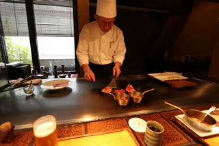 鉄板を挟んで料理人が焼いてくれるのを眺めることができる。