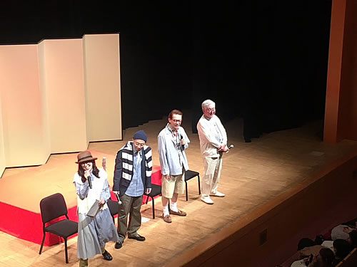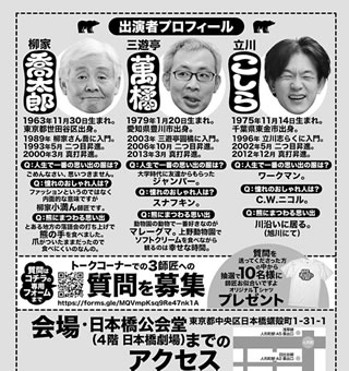 林家つる子のMCで3人の師匠がスポンサーのコスギのブランド「ゴールデンベア」の今春物を着て登場するトークタイムもあった。