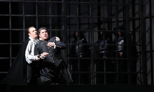 一方、カルロを慕うエボリ公女は、思いがけない出来事からカルロの本心を知ってしまい、エリザベッタへの嫉妬を燃えあがらせ、彼女を陥れる。さらに、カルロを救おうとしたロドリーゴは宗教裁判長の刺客により殺害される。ロドリーゴの身代わりによって解放されたカルロは、フランドルへ向かう前にエリザベッタに別れを告げる。そこへ国王と宗教裁判長が現れ、2人を逮捕しようとするが、前王カルロV世の霊声が響き渡り、カルロは前王の霊廟に引き込まれていく。