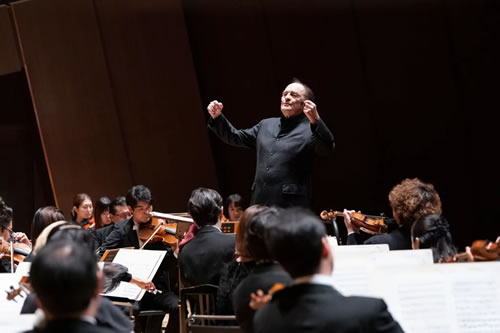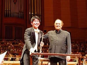 終演後、指揮台にフルート首席の野津雄太を上げて名演を讃えるデュトワ