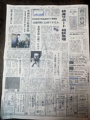 部数が300万台になって危機的と言われる朝日新聞の本日(8月20日火曜日)の第1面。