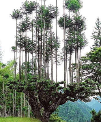 コレは、京都の北山地域で生産される「北山丸太」を収穫するための伝統林業技術「台杉」によって高く育てられた杉の木。(ベースの杉は600年物)