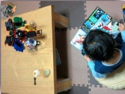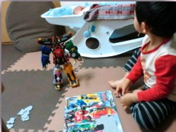 ちなみに哺乳瓶で飲みながら、ゴーカイオーを前に置いて、仮面ライダーの雑誌を熱心に見る長男様。