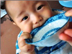 夕食時に重湯をあげているけど、スプーンでは物足りないのか、お皿ごと!!