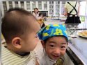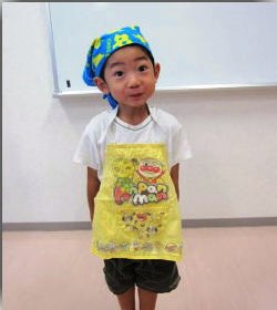 最初は「絶対嫌だ」と言ってたエプロンと三角巾、何だかきちんとしてくれ、大きな進歩!!