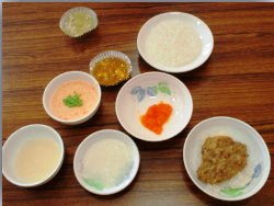 先生が作ってくれた、十倍粥、七倍粥、じゃがいもペースト、にんじんペーストもあってかなり盛りだくさんな離乳食。