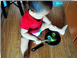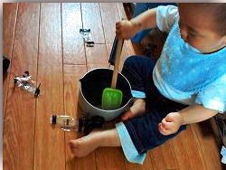 男しかいない我が家にままごとセットはないので、本物の鍋で遊ぶ。