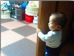 次男様が大をしたので、かーちゃん次男様を立たせたままオムツ変えてました。