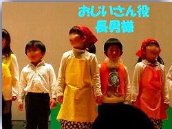 わからんちんの次男様、どうなることやらと思っておりましたが、家の後ろに隠れてて(座ってて)、狼役の子たちが出てきてふうふう吹くと、家が倒れてこぶたたちが出てくるという簡単な劇。