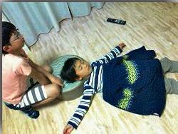 テレビ見ながら寝てしまった弟に自分の上着を脱いでかけてあげる長男様。