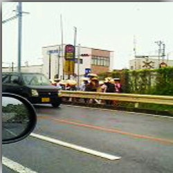 道中、歩いているみんなを追い越すけど、こっちは車、向こうは100q歩く、手を振ったりはできない。
