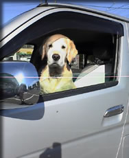 また別な日は、コンビニまで散歩。 駐車場をふと見ると、バンの助手席の窓から犬が!! あまりの間抜け面(←失礼)に、思わず写真を撮ってしまいました。