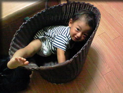 子供は狭いところがお好き♪のご多分にもれず、息子様も狭いところがお好き♪ 自分の体が入るところには、とりあえず入ってみる。 ある時はおもちゃ入れのかご↓