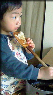 カレーの最後は、鍋にご飯を入れてまぜまぜ。 ちぃな両親にメールしました。 すると・・・「ぼっちゃんの朝ご飯、鍋から食べるのが好き(≧▼≦)」 「お、返事来たよ〜 ・・・同じメールが2通?」