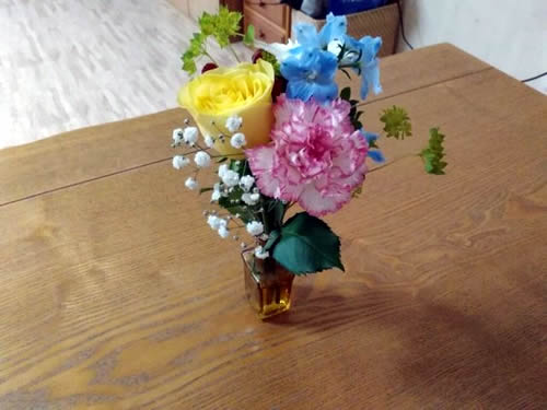 写真は学童で3~6月生まれ合同の誕生日会をやって 花束をもらった次男様(3月生まれ)