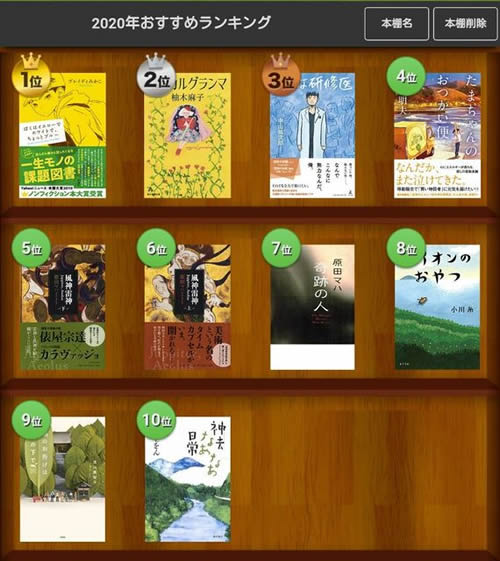 1位『ぼくはイエローでホワイトでブルー』 イギリスで暮らす日本人母とアイルランド人父の息子の話。 2位『マジカルグランマ』 女優で我が道を行く元気なおばあちゃんがおばけ屋敷作ったり。 3位『泣くな研修医』 郡山市の南東北病院の外科医の筆者。 4位『たまちゃんのお使い便』 最近読んでる森沢明夫。 元気が出ます。 5位、6位『風神雷神』 織田信長と俵屋宗達が謁見していたら? 7位『奇跡の人』 同僚に勧められて。 ~と思ってたけど、今思い返したら (配信:2021.2.25