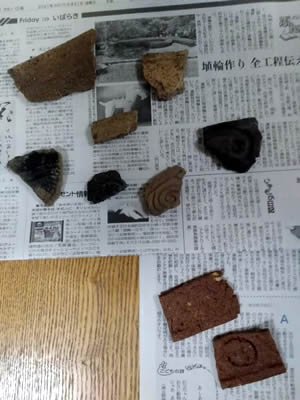 焼き上がり、こないだ拾ってきた本物と並べる(下の2個)。 接合にも挑戦、冷蔵庫で固めくっついた!! はーがーれーたーーーーマイガッ!!〇| ̄|_