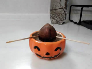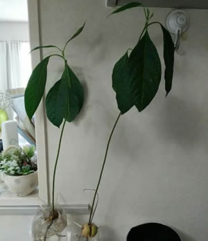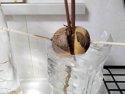 種を取り出して洗剤で洗い、楊枝を挿して下半分を水にIN。 ひと月以上たち、芽が出ない種だったかな~ 6個くらい種を水に漬けてたのですが 根っこが伸び始め、芽も出て