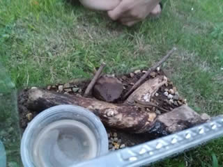 庭で見つけたイモムシを割りばしで入れたら飛びついてきて、次男様・・