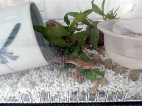 次男様がカナヘビを捕まえてきました。 虫かごを買って来て、世話することに。