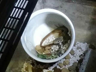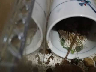 土を入れ替えたあげたり (土をその辺の庭の土から買ってきた赤玉土へ) 隠れる場所を作ってあげたり (ヒビ入って欠けてた砥部焼の湯呑を入れてみた) 住環境を整える。