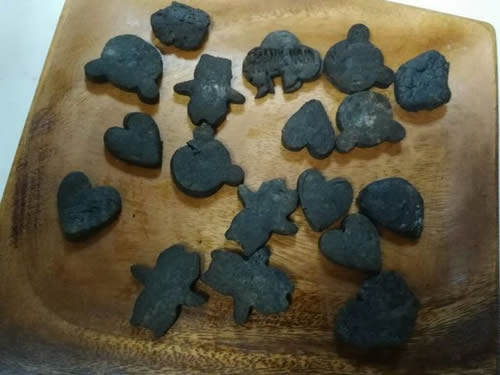 次男様とコネコネ、そういや土器クッキー用に 買った竹炭パウダーあるし、入れてみるか。