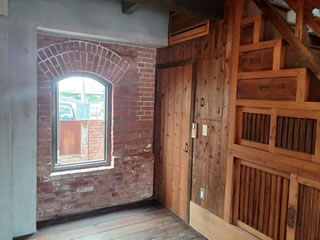 以下抜粋↓ 「江戸時代初期の鬼怒川開削によって、 んだそうな。 ちょっと待て、会津の米もここに来てたわけ!? どうやら、米を江戸まで運ぶのに栃木までは陸路で、そこから水運を使い、鬼怒川を延々下ってきた様子。 へええ、面白い! せっかく所有されている方と会うので、失礼を承知で「実はあっちの蔵が気になってるんですけど」と言ってみる(汗)。 図々しくも仕事と全っ然関係ない蔵の中まで案内して頂き、ひたすら恐縮するも興味深く見せて頂く。 梁を見ると別な建物を解体した再利用なのかもとのこと。 入り口上の煉瓦が斜めなのは装飾? 後日、さらに図々しくも埋文調査員の夫も一緒に再び訪問。 下の色が違うのは焼締めレンガと言って、釉薬を塗って高温で焼くため水が染みないのですが、表面だけのようなので、たぶん見栄え重視だろうとのこと。