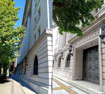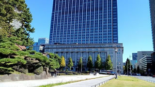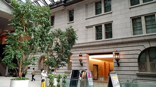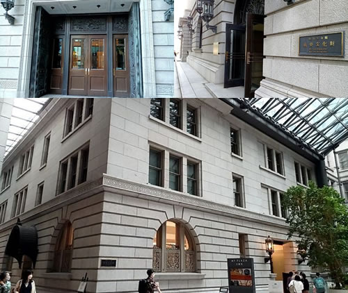とまあ、一通り見終わり、目的を果たせば後はおうちに帰りたい夫と別れ、丸の内散策です。 静嘉堂美術館は元々は三菱の岩崎彌之助と小彌太が世田谷に作った美術館ですが、丸の内で展示を移転することになったようです。 で、その移転先が重要文化財・明治生命館。 チラ見しただけの建物の方が気になってしょうがないので、外観をぐるっと。 手前が重要文化財・明治生命館。 だからエスカレーター上がったらいきなり重要文化財で建物in建物みたいになってたんですね。