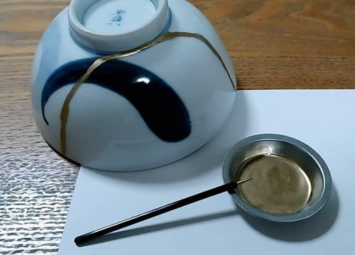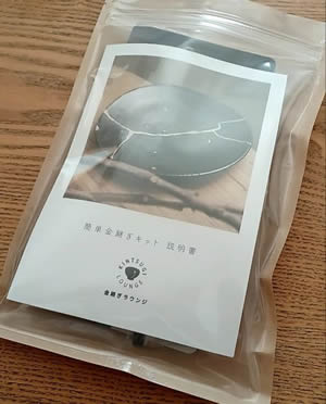 破片もなく綺麗に真っ二つなので、前からやってみたかった金継ぎに挑戦。 まずは夫がAmazonで、金継ぎ初心者用セットを購入。 初心者キットなので、接着剤でくっつけた上に金を塗るという金継ぎ気分は味わえます的な。 まずは接着剤でくっつける。