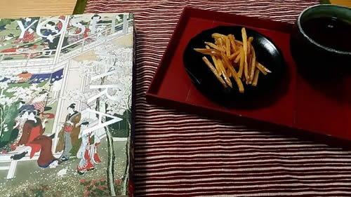 夫購入の図録(これがめっちゃ分厚くて重い、その分高い)に書いてありましたが、江戸時代の二大悪所として、歌舞伎芝居と吉原が挙げられていました。 今となっては、方や日本を代表する文化芸術、方や禁忌のような扱い。 この時代、こういう所があって一生懸命生きてた女性たちがいたことは知ってて欲しいな、と思います。 一番好きだったのは、 吉原の一日を12枚の浮世絵にしたものですが、辰の刻(午前8時前後)は、たぶん高校生くらいの女の子2人が朝目覚めたところ。 借金のかたに売られたのは想像に難くありませんが、同じ年頃の子供を持つ身としては、友達ができたり、おいしい物を食べられたり、綺麗な着物を着たり、楽しいことや嬉しいこともあって欲しいなと思います。 この図録を見る時のお茶請けは、かりんとうとか豆大福とかみたらし団子とか、町娘的なおやつがいいな、と思い、ちょうど良かった、香川から送られてきた芋けんぴをお供に。