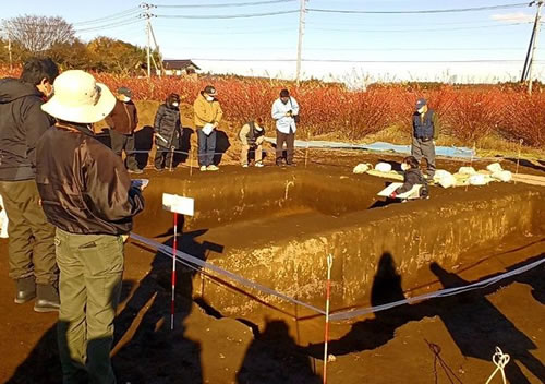 真冬の関東平野、畑の中ですよ、ふきっさらしでめっちゃ寒いのは分かっていたので、ユニクロ最強ダウンに手袋で完全防備で挑む。 が、分かっちゃいても風強し、寒し。 1983年(昭和58)年に旧新治村の村史編纂事業の一環として、母校が発掘していたらしい。 みずら(結った髪の毛)が見つかったことで有名なようです。 当時は円墳とされていたのですが、今回の再調査で方形の方墳とみられることが分かったとのことでした。 当時は学生として参加し、髪の毛も見つけた、現教授の先生が説明してくださる。