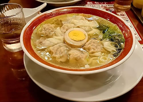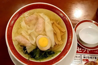 まだ11時なので並んではおらず、すんなり店内へ。 注文して待ってる間に次々来店、満席になり、早い時間を目指して正解。 私の肉わんたん麺塩味。
