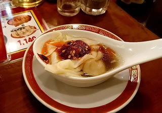 夫の海老丸ごとわんたん麺。 麺は細めのストレートで塩味のスープとよく合います。 ワンタンは店員さんが教えてくれた通りに、ワンタン用レンゲで、まずはそのまま、あとは好みの味付けで。 好きだったのは甘酢玉ねぎと、食べるラー油+黒酢の組み合わせ。 ランチにも岸波通信様々ですわ。 (配信:2024.10.31