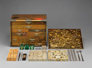 さてさて、目的は、『百草蒔絵薬箪笥』。 超豪華な薬箱です。 製作は飯塚桃葉、阿波徳島藩主・蜂須賀家のお抱え蒔絵師だそうな。 薬箪笥も蒔絵がコラージュのようになっており、こういう意匠の蒔絵は今までに見たことがなかったのでとても新鮮。寄裂というらしい。 引き出しに収められてた銀の合子も模様がとても精緻で綺麗で、蓋と本体が綺麗に収まるのが素敵です。 箸にも薬匙にも細かーい模様が彫られているのがすごい。 緒方洪庵が使ってた薬箱もあったりして、すげー!!!(≧▽≦)となる。