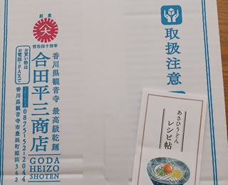 1袋(250gは3玉分ですと書いてある)を1人で食べるようになってしまい、瞬殺もええとこなので、婆さまにいっぱい欲しいと要請したらばですね。ついに店から箱で直送。 うどんの細麺、太麺、冷麦各種。
