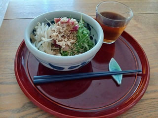 てなわけでさっそく、にーさんのうどん3玉御膳。 ちょうどいい皿がこれしかなくて、iittalaの平皿にうどんが盛り広がる。 かーちゃんのは、うどんだけちょっと分けてもらって、きゅうりと水菜の中華合え、茹でもやし、茗荷の甘酢漬け、鶏そぼろを盛った上から白だし少々、野菜多すぎぶっかけうどん。 シンプル・イズ・ベストな男性陣と対照に、具いっぱいが好きなもんで。 うむうむ、ええ感じや。 (配信:2025.8.7