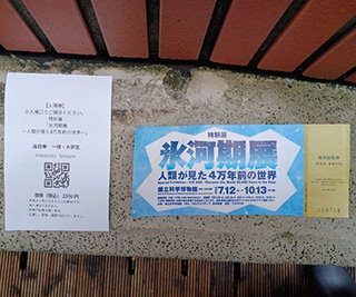 さて、氷河期展です。 もらったチケットは1枚なので、当日券をその場で購入。 最近はQRコードなので、当日券買ってもピラっとこれなのね!Σ( ̄□ ̄;) 招待券と当日券、落差がすごくないかΣ( ̄□ ̄;) さてさて、館内は骨格標本と再現した動物たち。