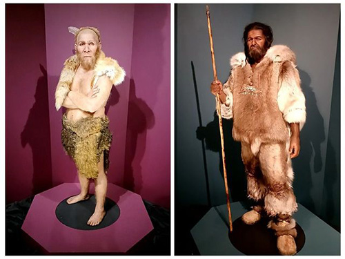 氷河期の動物たちは、やはりとんでもなく大きいですね。 目玉は、クロマニヨン(右)とネアンデルタール(左)の頭骨標本と全身の復元模型。