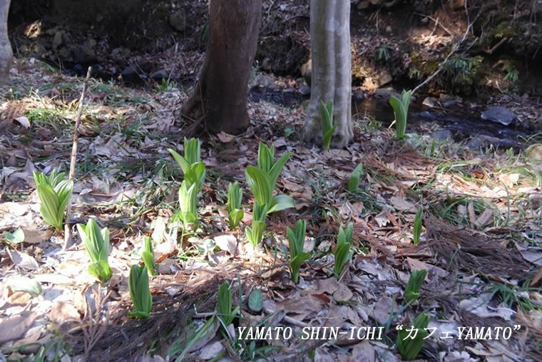 カフェYAMATOの春です まだまだ寒いけど 周りには、コバイケイソウの新芽が ぞくぞくです 間もなくカタクリの花で一面ピンクになります