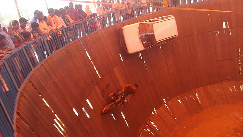命知らずのお兄ちゃんは でっかい桶の中を ひたすら激走 おいおい 後ろの車に追い付かれてるぞ