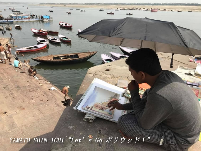 こうもり傘の日よけの下で 日がな 絵を描く青年の姿 ここはバラナシ 灼熱の街 UVカットは必須と見た