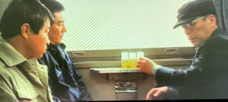 写真は、傷害致死事件の被告として2年以上4年以下の刑が確定した健さんが急行列車で網走刑務所へ護送される際の車中で、護送刑事が駅弁を食べるシーンから。車窓の棚にお茶の瓶が3個置かれている。