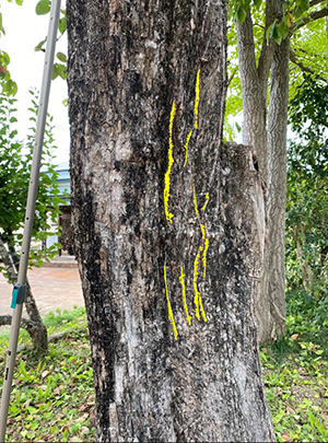 写真は友人宅玄関前の柿の木に残された熊の爪痕。見やすくするため黄色で着色してみた。