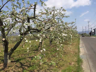 ロード側の果樹園では、今が盛りの桃の花に続き、りんごの花が咲き始めた。桃ほどの華やかさはないが、清楚で美しい。