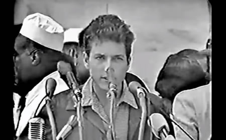63年6月にミシシッピ州で開かれた学生全米調整非暴力委員会(Student Nonviolent Coordinating Committee(1960年に結成された、黒人学生を中心とした反戦・反差別の組織)主催の選挙人登録集会に参加し、公民権運動の中心的な組織である全国黒人地位向上協会(NAACP)のミシシッピ州の幹部が何者かによって射殺されたことを直接テーマとした「しがない歩兵〈Only a Pawn in Their Game〉」という自作の曲を歌った。