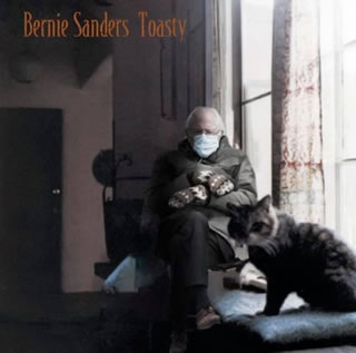 2枚目は、熱心な民主党支持者であるキャロルが、ジョー・バイデン米国大統領就任式(2021.1.20)にスノーボード用パーカーに古着のセーターを再利用した手袋を着用した「防寒着平服」で参加したバーニー・サンダースの写真とTapestryのカバー写真を合成したもの。