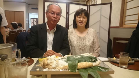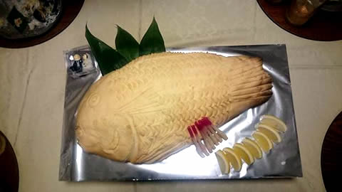 I am in marry party of my wife s friends. The cuisine is baked red sea bream in salt. It is great cuisine of fish!